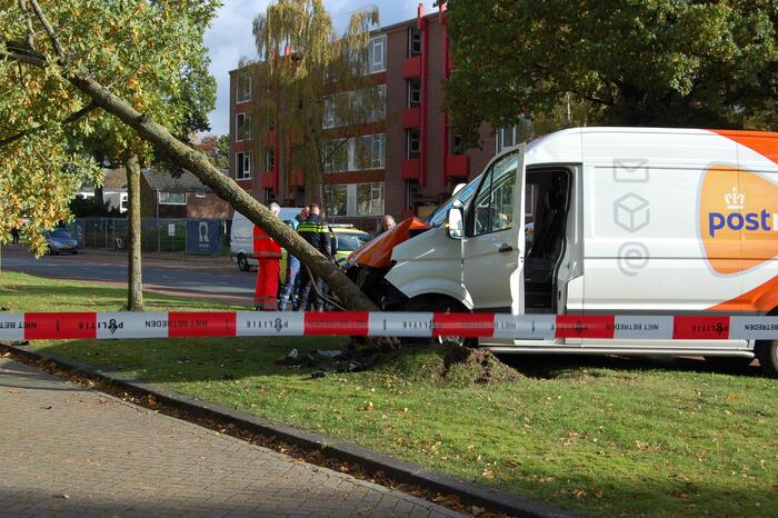 Een pakketbezorger raakte hierbij zeer ernstig gewond. De bus heeft een lantaarnpaal en een boom volledig uit de grond gereden. De bestuurder van de bus wordt in de ambulance gereanimeerd.