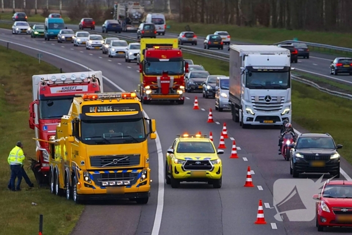 Van Hoogeveen naar Assen staat volgens de ANWB een file van zo'n 7 kilometer. Een berger zal de vrachtwagen afslepen.