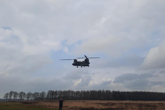 WAPSERVEEN - Donderdagmiddag 25 maart rond 15.00 uur wordt door een technisch team van Vliegbasis Gilze-Rijen geprobeerd om de Chinook-helikopter te repareren, welke gisteren een noodlanding moest maken op het militair oefenterrein bij Darp aan de Westerzandpad in 112 Wapserveen.