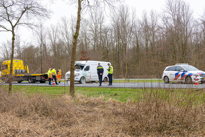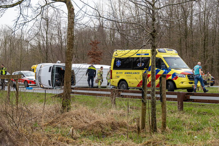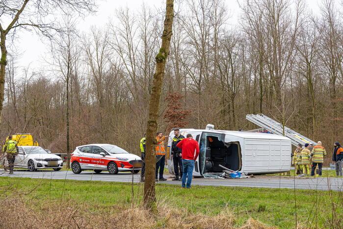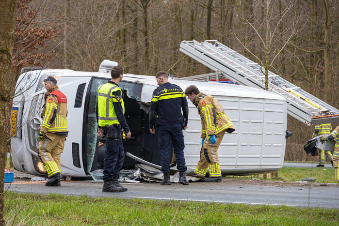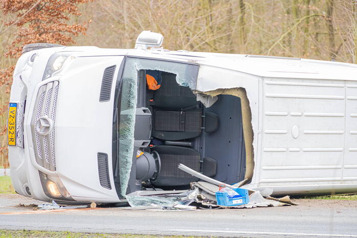 Een bestelbus van een pakketbezorger belandde op zijn kant. De bestuurder, die alleen in het voertuig zat, raakte niet gewond. Brandweerlieden kwamen ter plaatse om de voorruit kapot te zagen. Het slachtoffer werd opgehaald door een collega.