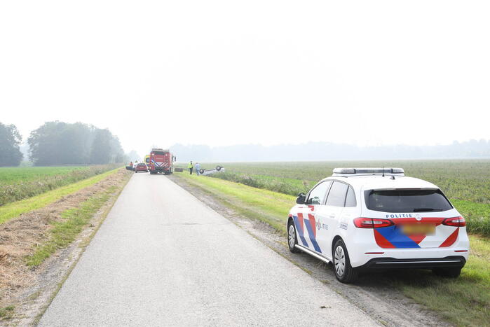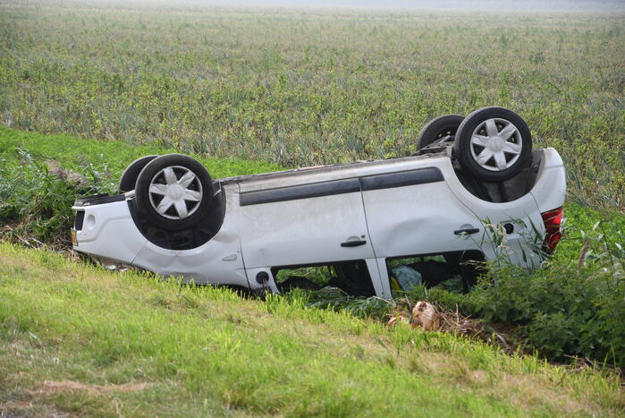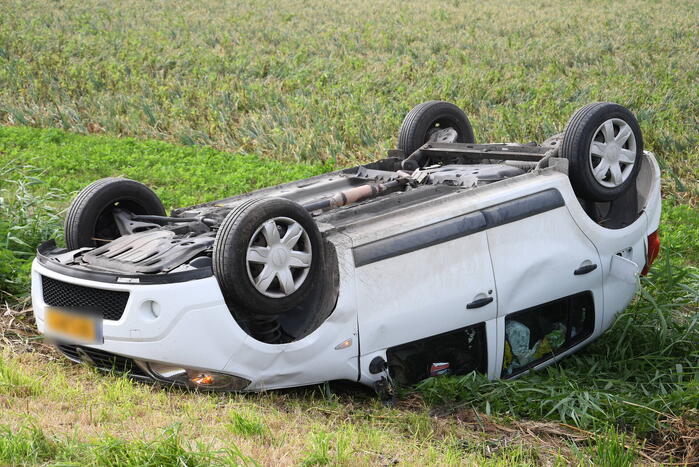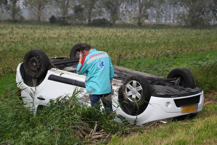 Een automobilist was van de weg geraakt en op zijn kop in een greppel naast een weiland belandt. Omdat het niet zeker was of de inzittende bekneld zat, werd de brandweer ingezet. De bestuurder is behandeld in een ambulance.
