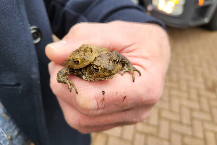 De twee padden waren in een regenafvoer langs de weg terechtgekomen en konden hier niet meer zelf uitkomen. Omdat het kinderen niet lukte om de put open te krijgen werd de brandweer ingezet. De twee dieren zijn weer in de natuur uitgezet.