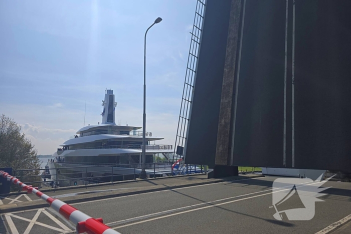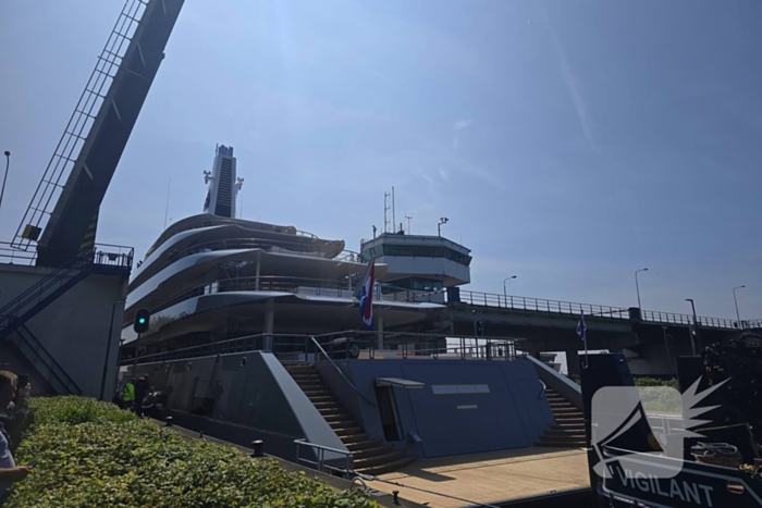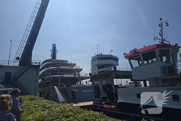 Het jacht kwam door de Houtribsluizen gevaren. Dit onder begeleiding van een sleep- en duwboot.