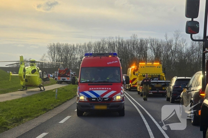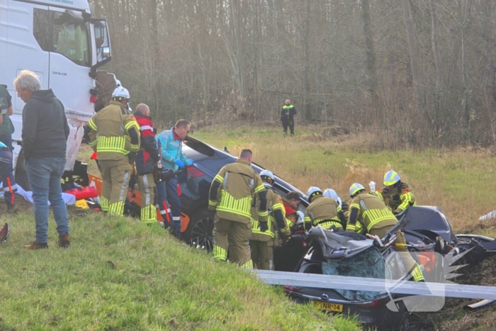 De hulpdiensten zijn in groten getale aanwezig, en er is ook een traumahelikopter ingeschakeld. Bij het ongeval zijn meerdere voertuigen betrokken geraakt, waaronder twee personenwagens die in de sloot tot stilstand zijn gekomen. Daarnaast staat er een vrachtwagen dwars over de weg. Ongeveer 50 meter verderop staat een voertuig dat aanzienlijke schade heeft opgelopen.