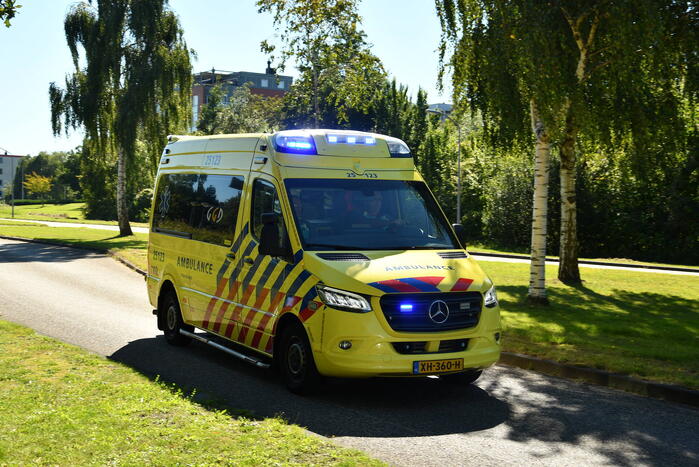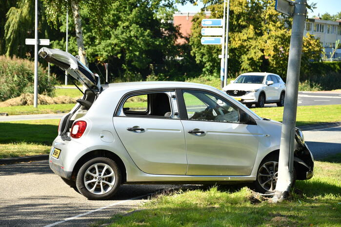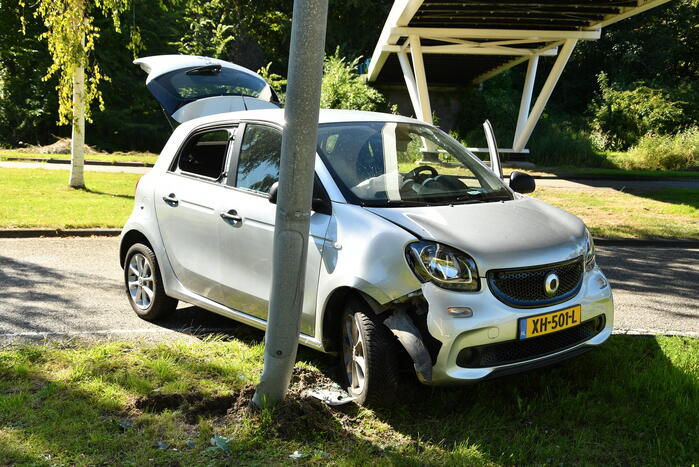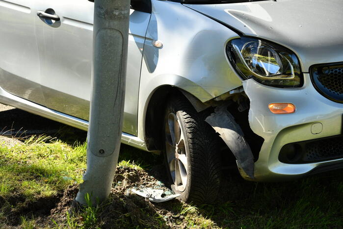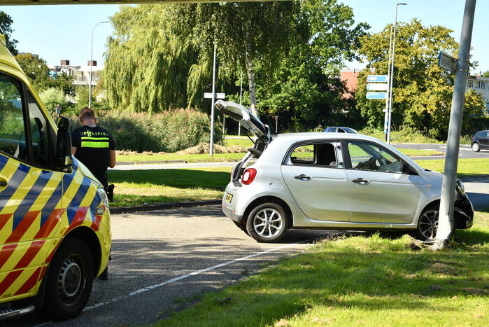 Een vrouw is met haar auto tegen een lantaarnpaal aangekomen. De vrouw is zelfstandig uit haar auto gekomen en is op de grond gaan liggen. ambulancepersoneel heeft haar nagekeken in de ambulance en is hierna vervoerd naar het ziekenhuis voor verdere behandeling.