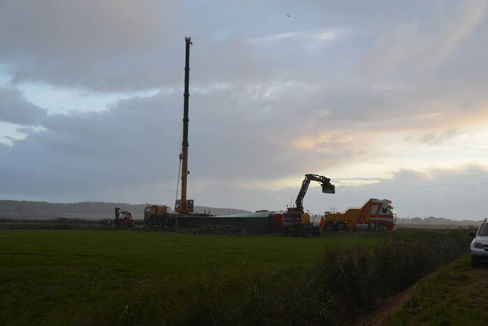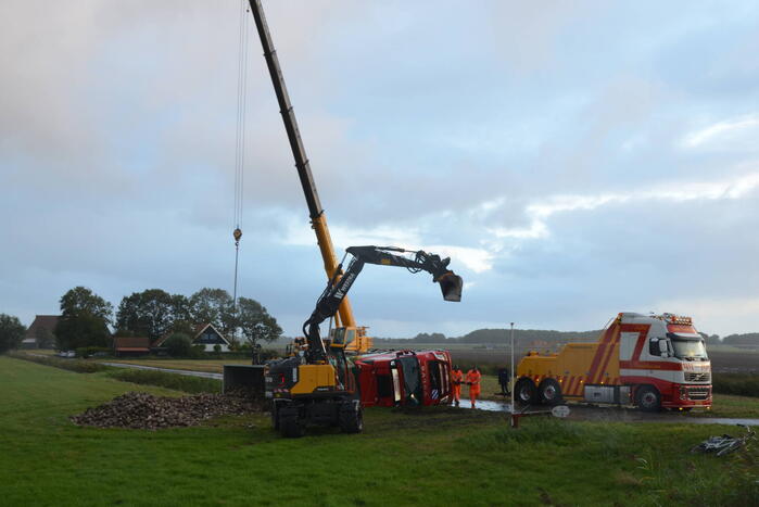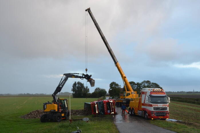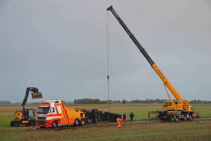 Een vrachtwagen geladen met suikerbieten was hier eerder gekanteld en naast een weg terechtgekomen. Met behulp van een telescopische kraan en een bergingsvrachtwagen wordt de vrachtwagen en oplegger weer recht getrokken. Hoe de vrachtwagen kon kantelen is nog onbekend.