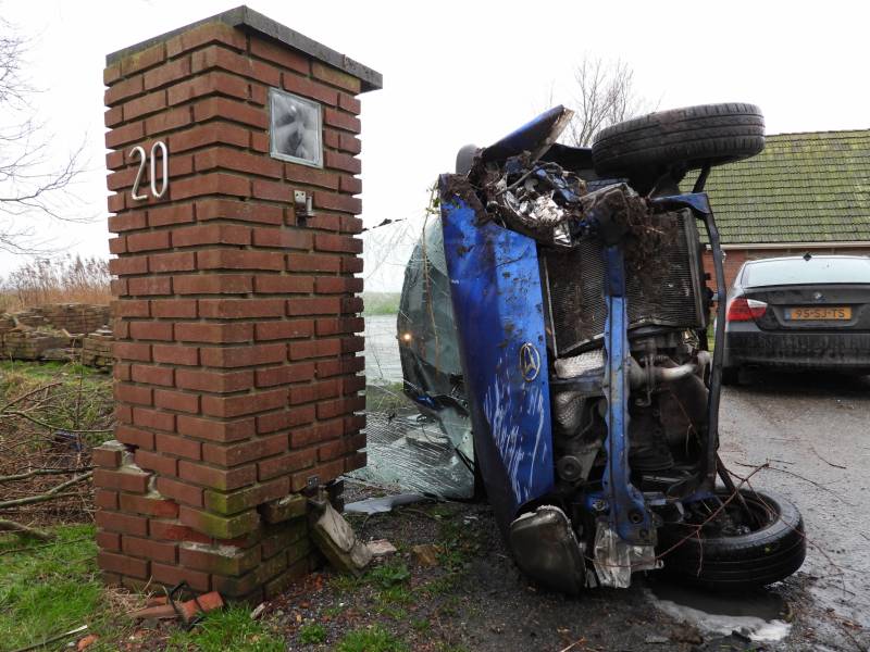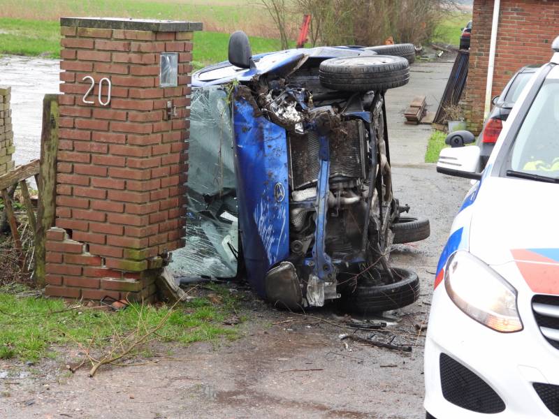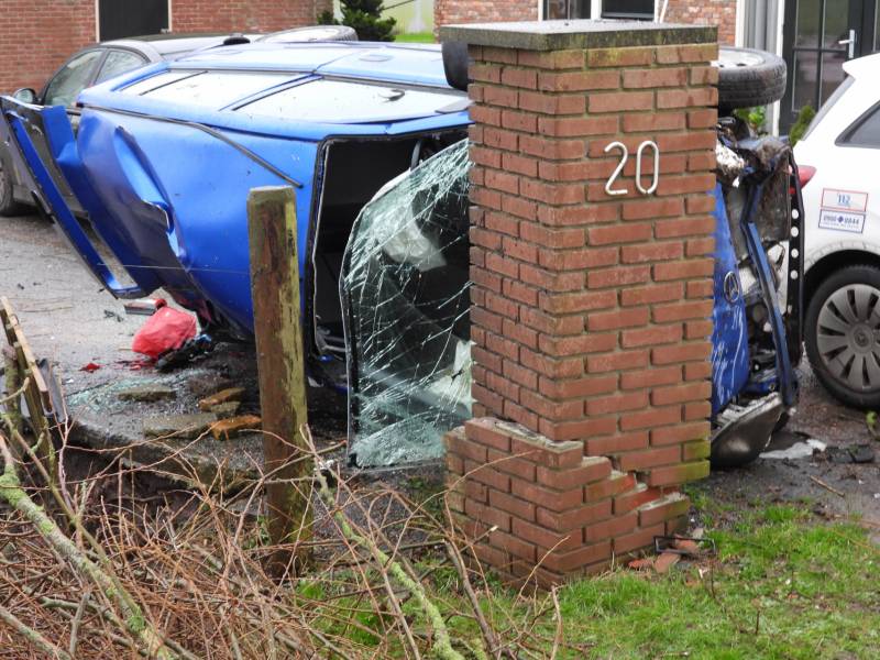 Een auto is op zijn kant belandt na eenzijdig aanrijding. Van de auto is niet veel meer over dan een hoop puin. Een persoon is met onbekende verwonden met een ambulance naar het ziekenhuis vervoerd.