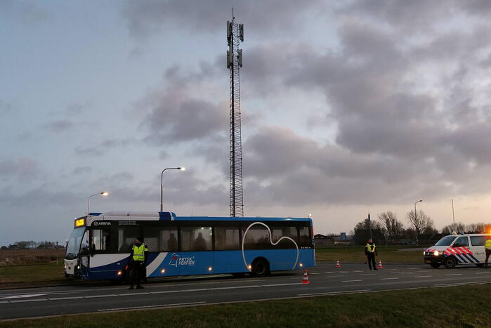 Een personenauto en een lijnbus waren met elkaar in botsing gekomen. De personenauto raakte daarbij flink beschadigd. Een berger heeft het voertuig afgesleept. De lijnbus belandde gedeeltelijk in de berm en liep schade op aan de voorzijde.