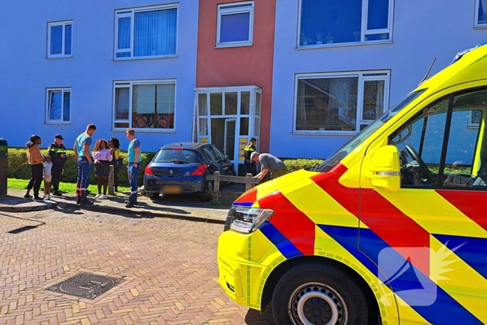De bestuurder van een auto, met kinderen daarin, reed door een hek tegen een portiek aan. De bestuurder is een ambulance nagekeken maar vervoer naar het ziekenhuis bleek niet noodzakelijk.