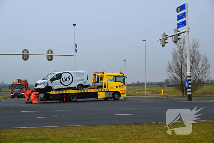 Een bestelbus en een personenwagen kwamen hier met elkaar in botsing. Het ambulancepersoneel is ingezet om medische hulp te verlenen aan de betrokkenen. De betrokkenen worden gecontroleerd door het ambulancepersoneel.