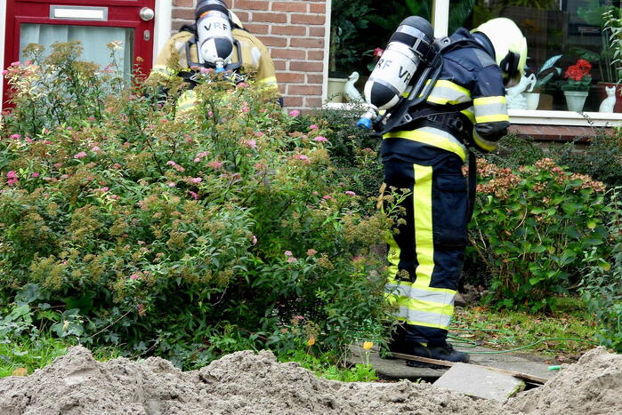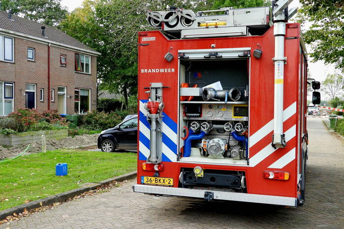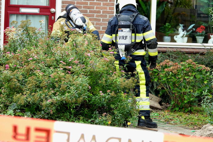 De lekkage ontstond door werkzaamheden tijdens de aanleg van glasvezel. De brandweer heeft afzetlint opgehangen en metingen in en bij de woning verricht.