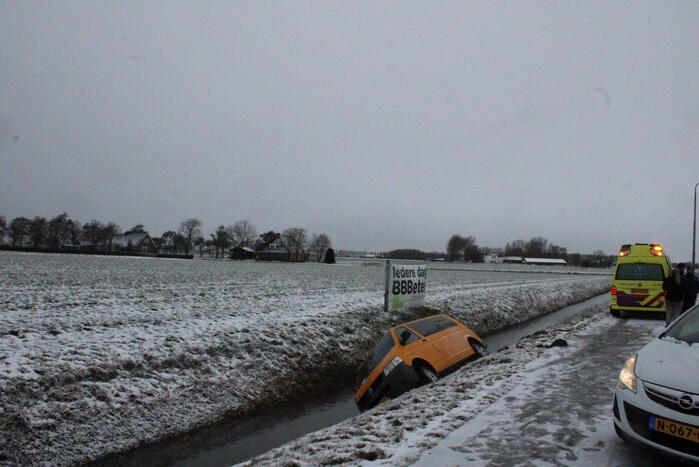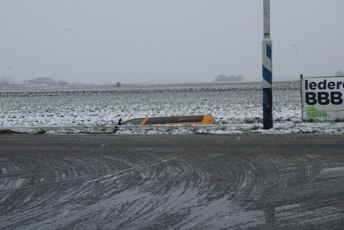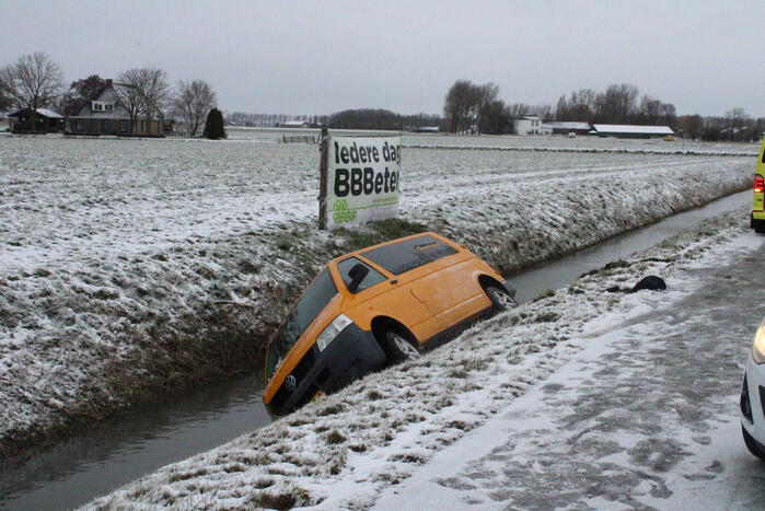 Een bestelbus was hier de bocht uit gegleden door de sneeuw en in de sloot terechtgekomen. De ambulancedienst heeft de inzittenden van de bestelbus gecontroleerd op verwondingen.