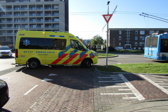 Een bakfiets is aangereden door een personenauto tijdens het oversteken bij een rotonde. De bestuurder van de bakfiets is door ambulancepersoneel nagekeken in de ambulance. Na behandeling in de ambulance is de bestuurder overgebracht naar het ziekenhuis voor verdere behandeling.