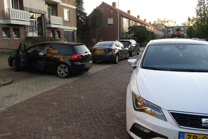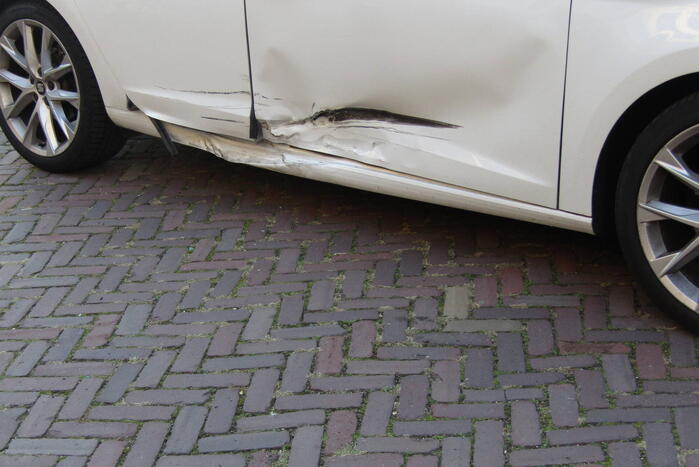 Eén van de betrokken auto's raakte door de botsing flink beschadigd aan de zijkant.