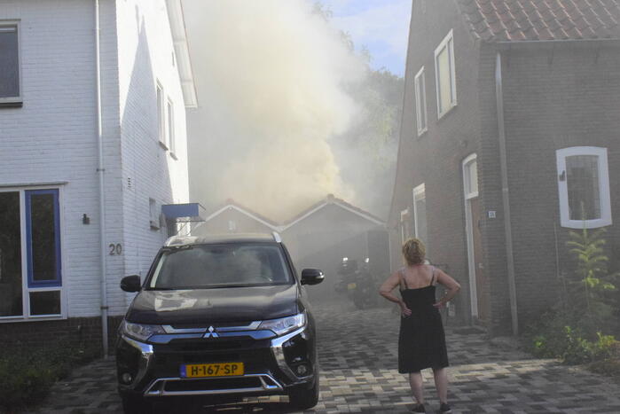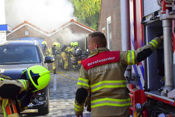 De brandweer zette in om overslag naar een tweede garagebox te voorkomen. De schade door de brand is groot.