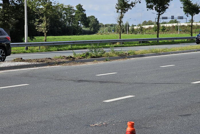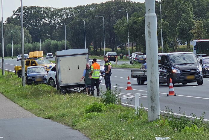 Een markttwagen is losgeschoten van een bakwagen. Hierbij is de aanhanger door de middenberm geschoten en op de tegengestelde weghelft terechtgekomen.