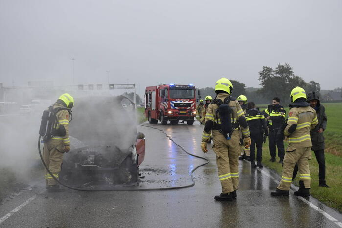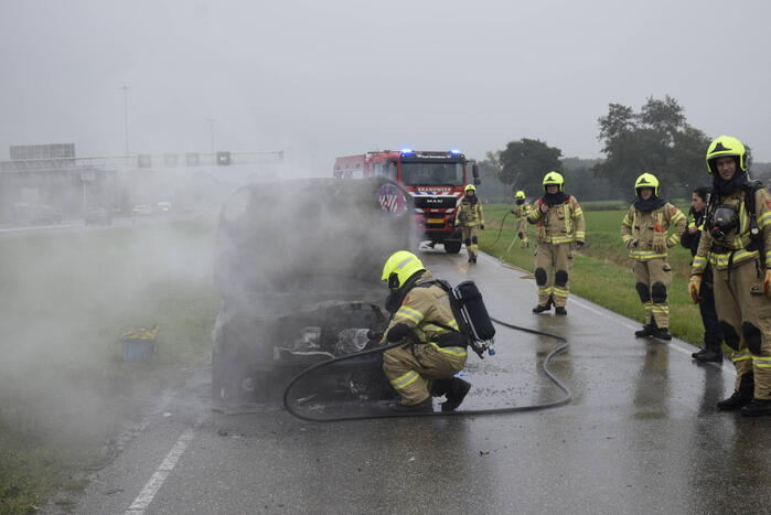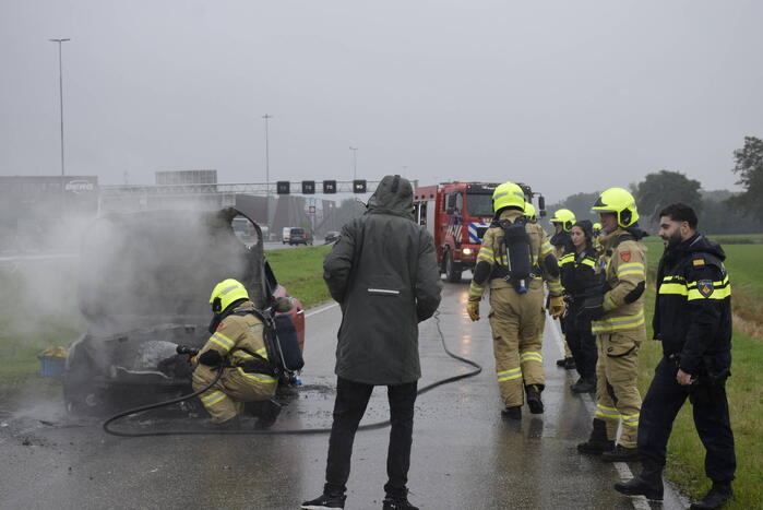 Hoe de brand heeft kunnen ontstaan, is niet bekend. De brandweer wist het vuur snel te blussen, maar de schade aan de auto is behoorlijk. Het verkeer op de naastgelegen Rijksweg A12 ondervindt enige hinder van het incident en de rook waardoor een snelheidsbeperking is ingesteld.