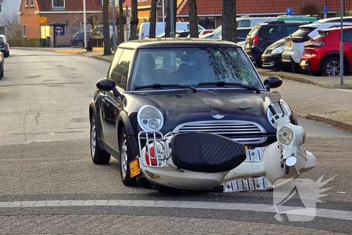 Een dame op een scooter en een automobilist zijn met elkaar in botsing gekomen. Vermoedelijk betreft het een voorrangsfout. De scooterrijdster gaat op eigen gelegenheid naar de dokterspost.