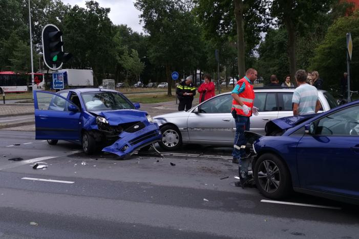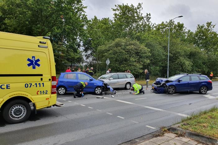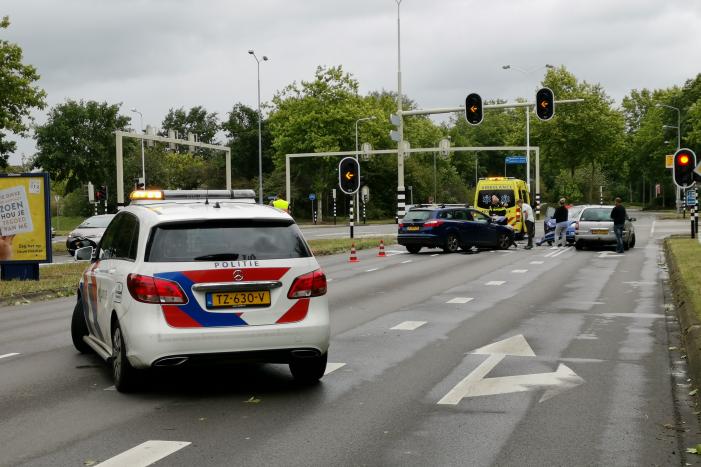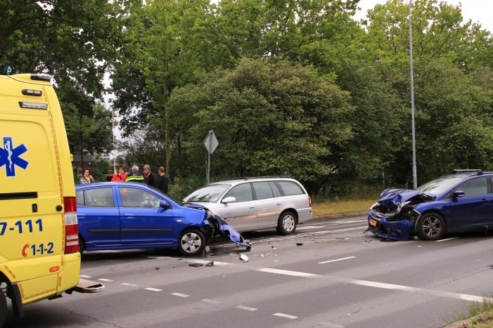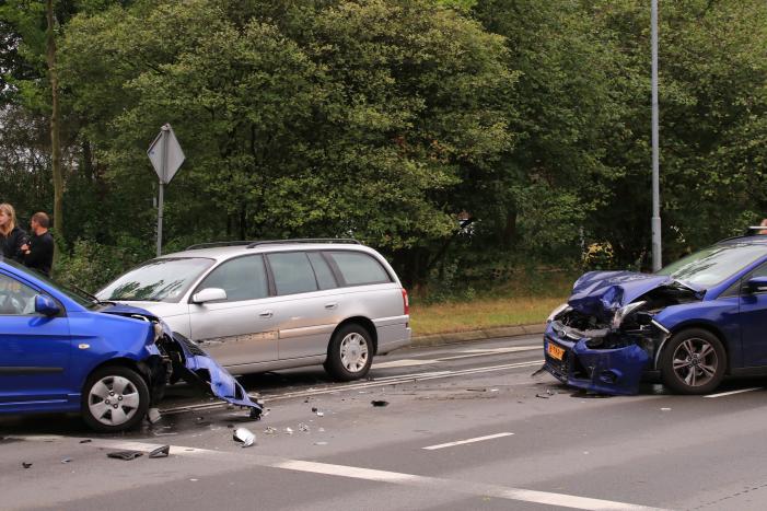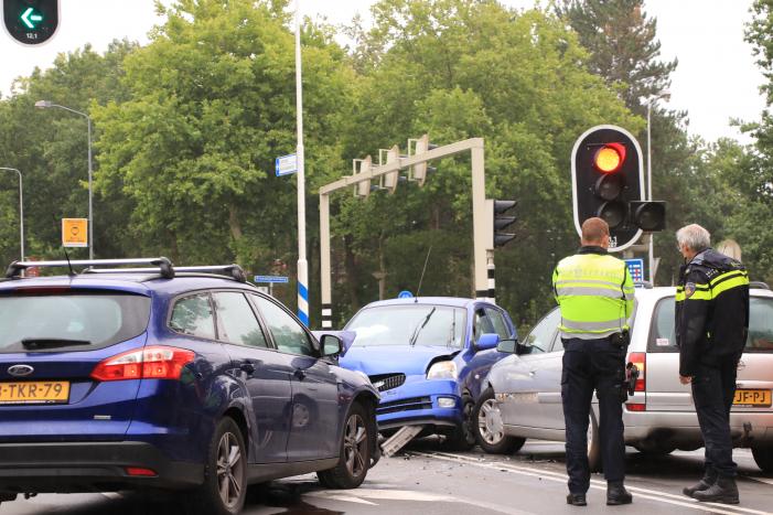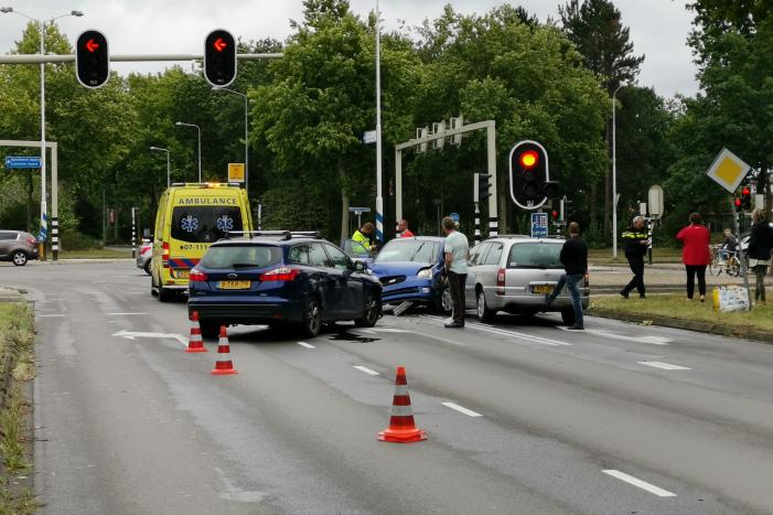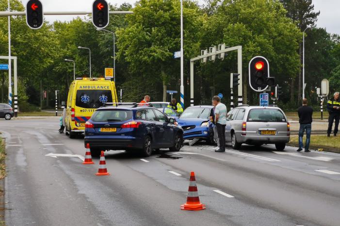 Voor het stoplicht zijn drie auto's op elkaar gebost. De schade aan de voertuigen is groot. Hoe het verkeersongeval heeft kunnen gebeuren is niet duidelijk. Vermoedelijk heeft een van de auto's de verkeerde afslag genomen.