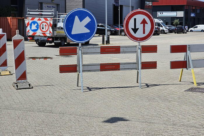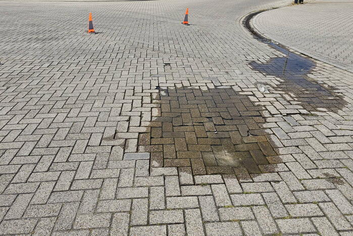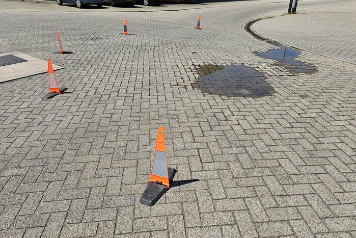 Het water komt via de straattegels omhoog, waardoor de tegels inzakken. De gemeente heeft een klein gebied afgezet voor verkeer, zodat de schade niet erger kan worden. De gemeente en het nutsbedrijf zullen de waterlekkage verhelpen.