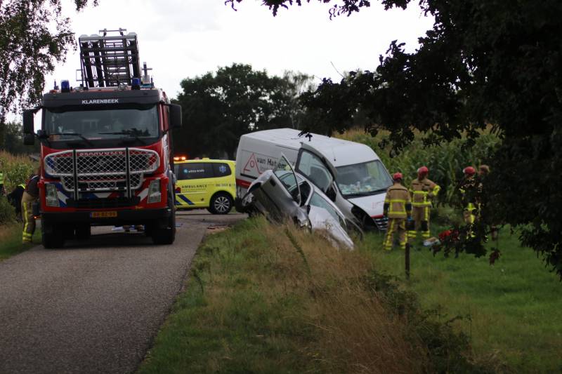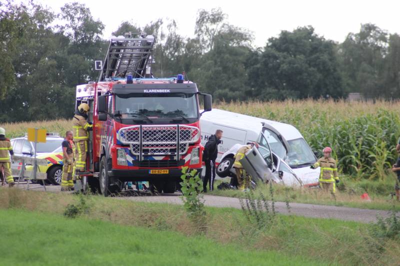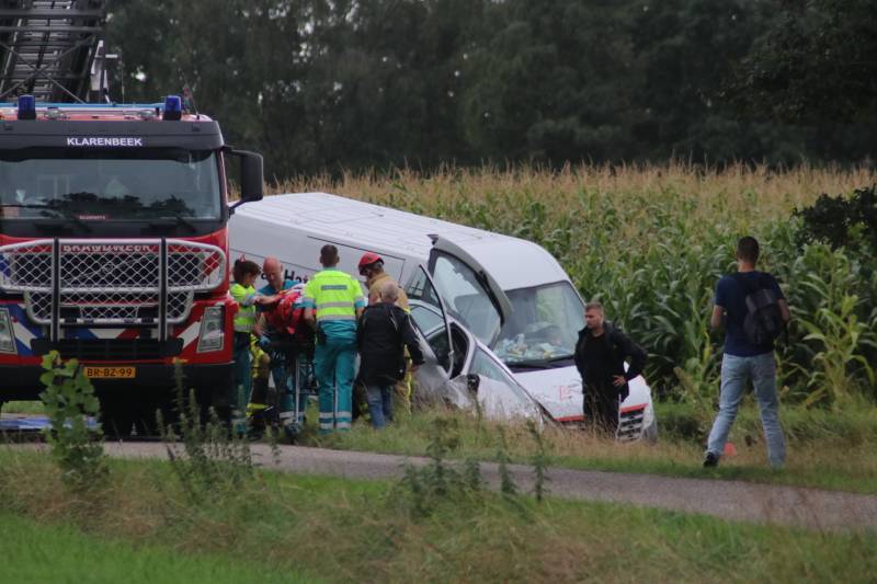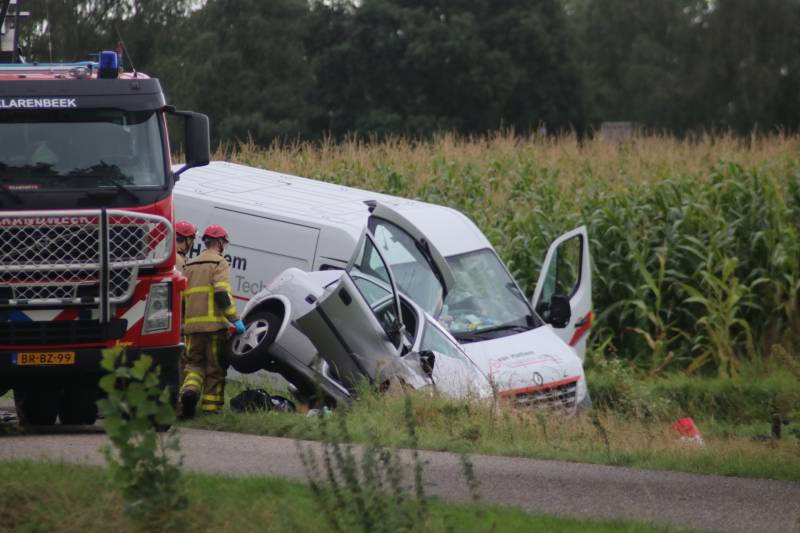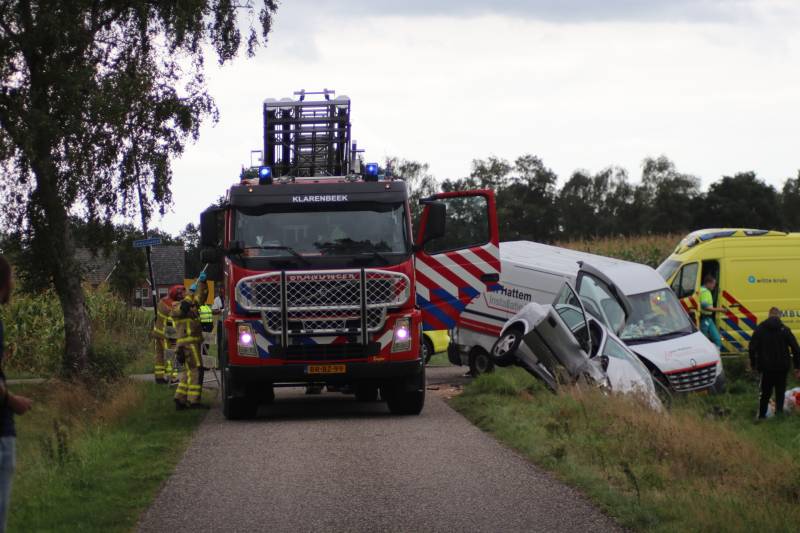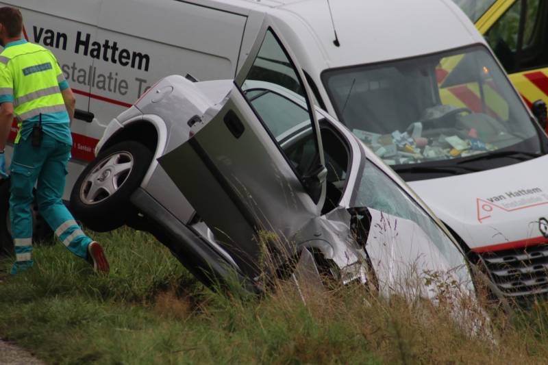 Een bestelbus en auto zijn in botsing gekomen en in een greppel beland. Er zijn meerdere gewonden gevallen. Een inzittende is met een ambulance naar het ziekenhuis vervoerd.