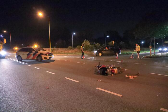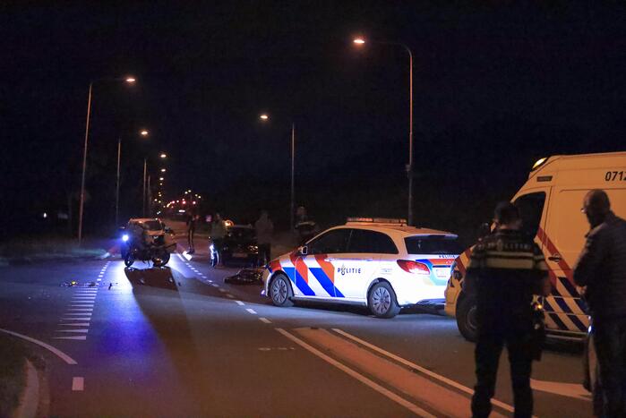 Een motorrijder en een personenauto zijn op de kruising met elkaar in botsing gekomen. Door het ongeval raakte de motorrijder gewond en werd gecontroleerd door ambulancepersoneel. Na controle werd het slachtoffer voor verdere behandeling overgebracht naar een ziekenhuis in de omgeving.