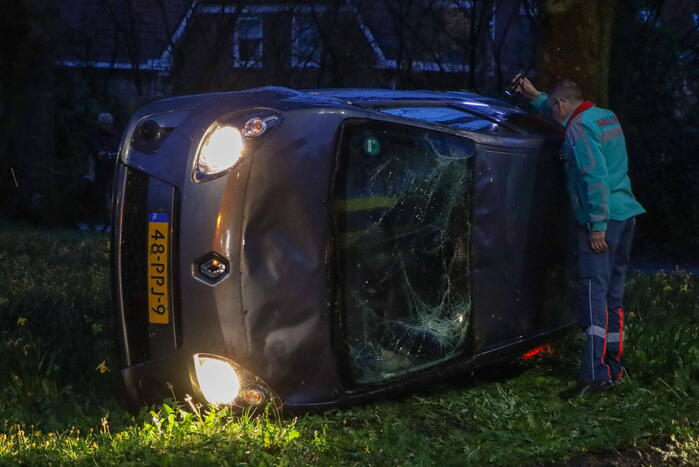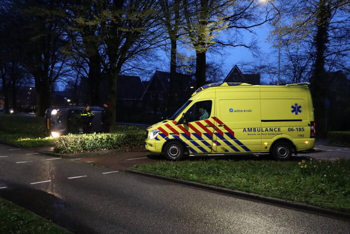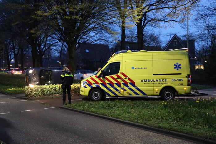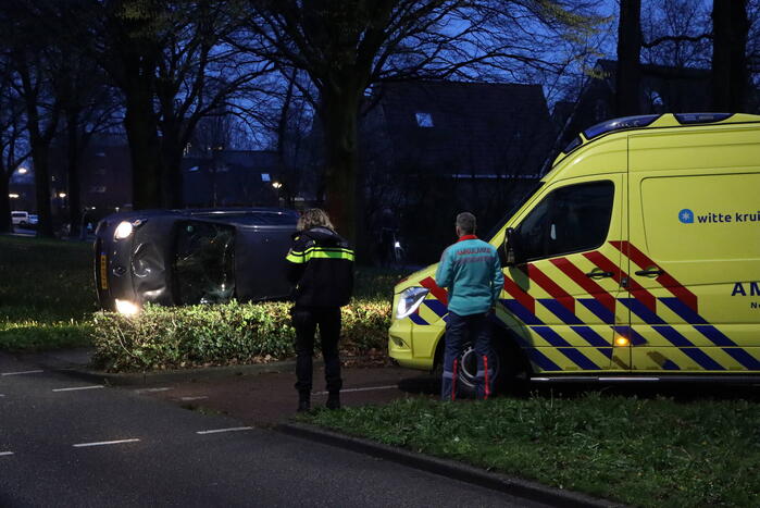 Een personenauto raakte van de weg, kwam in de middenberm terecht en belandde op zijn zijkant. De bestuurder is in de ambulance door het ambulancepersoneel behandeld maar hoefde niet naar het ziekenhuis te worden vervoerd. De auto liep flinke schade op.