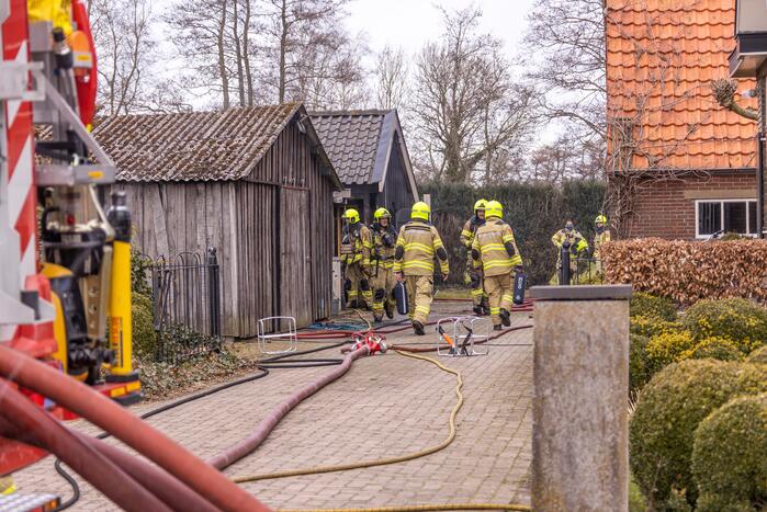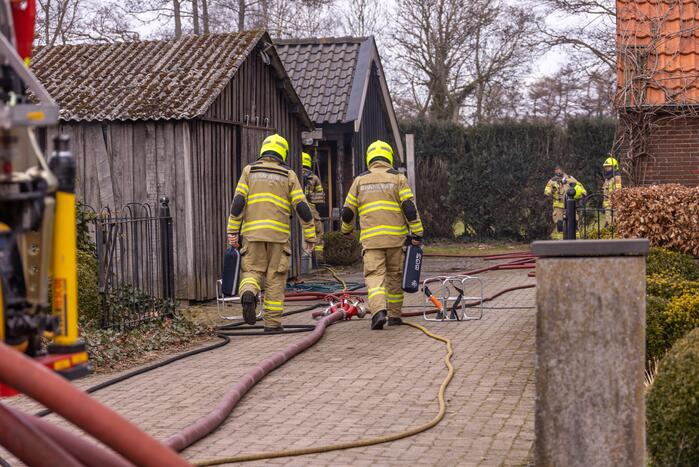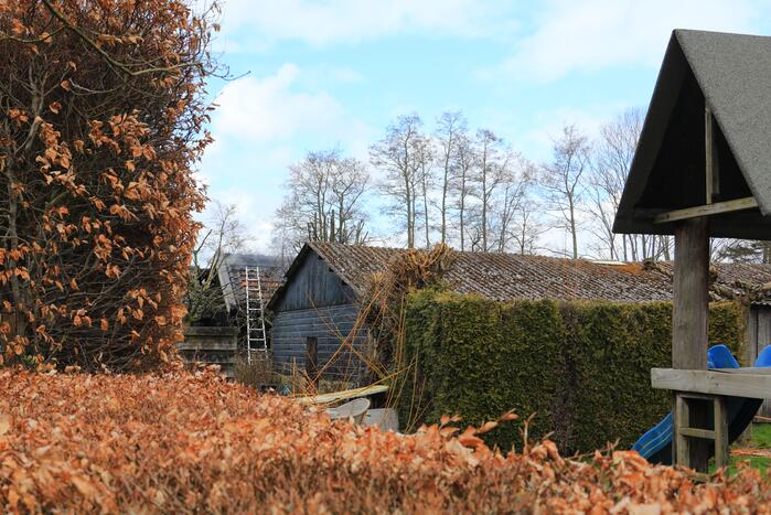Brandweermannen hebben dakpannen van de schuur verwijderd om beter bij de brand te kunnen. De brandweer heeft de brand geblust. Vermoedelijk is in de schuur asbest aanwezig.