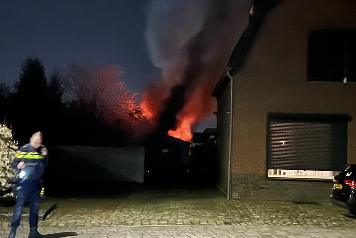 De vlammen sloegen meters hoog bij aankomst van de brandweer. In een bijgebouw woedt brand. Niemand raakte gewond.