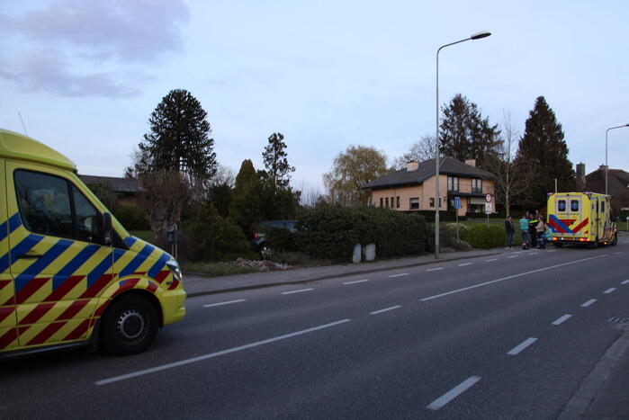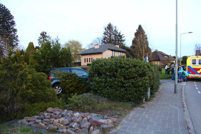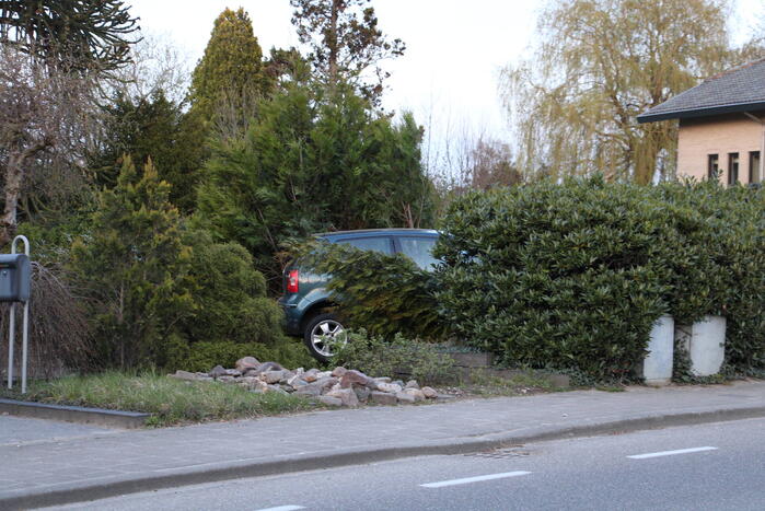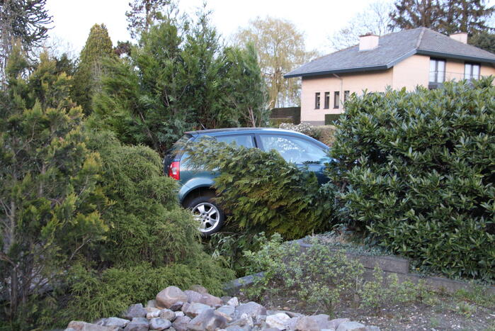 Een personenauto is door onbekende oorzaak achteruit een voortuin ingereden. De bestuurder is gecontroleerd door het ambulancepersoneel, maar raakte niet gewond. Een berger zal komen om de auto af te slepen.