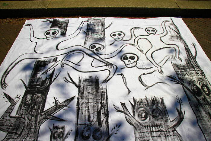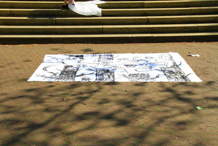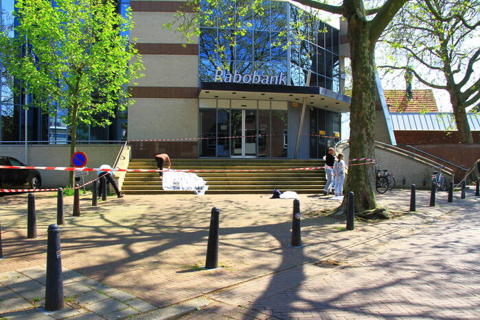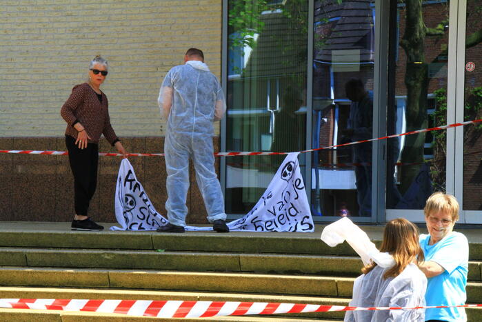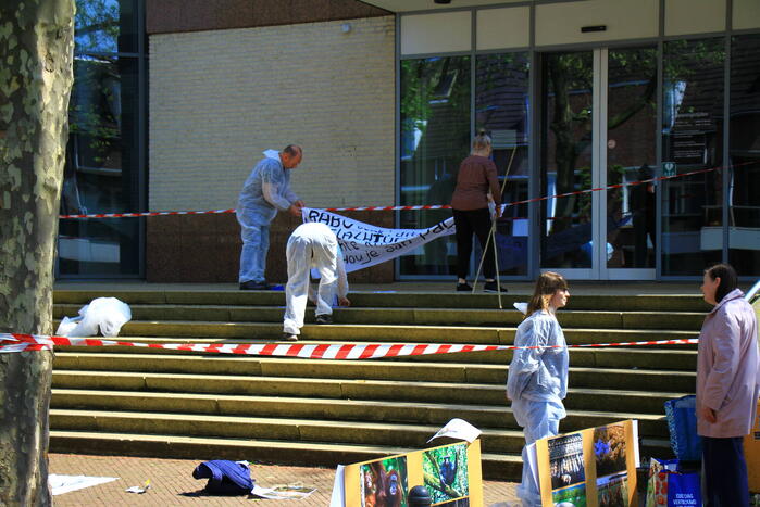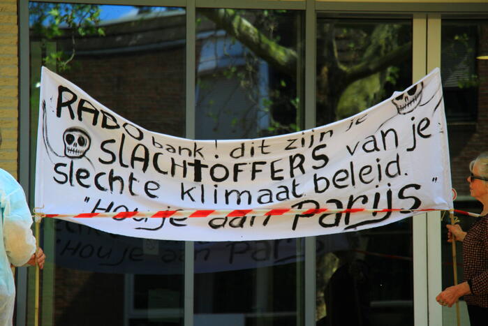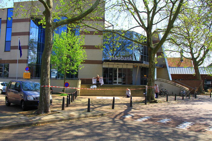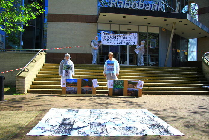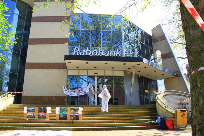 Dit betrof een groep klimaatactivisten die actie voerden voor het pand van Rabobank. Meerdere actievoerders lopen in witte pakken rond hadden hun omgeving gedeeltelijk afgezet met lint. Naast een groot spandoek hadden ze borden waarop verschillende foto's waren geplakt die met het klimaat te maken hebben.