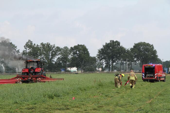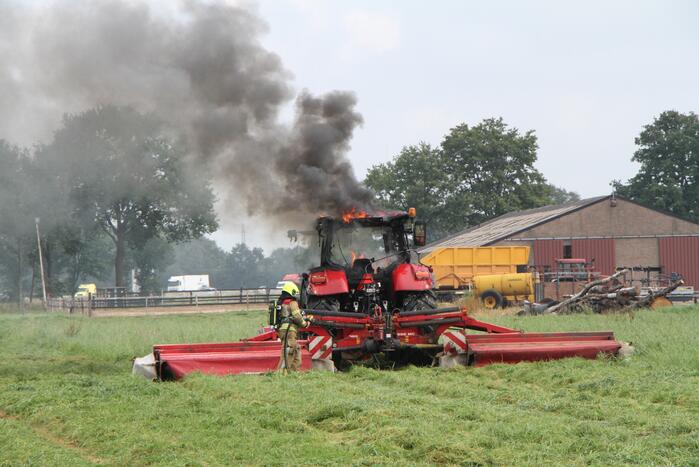 De tractor was bezig met maaiwerkzaamheden in een weiland toen dezej in brand vloog. De brandweer is met een brandweervoertuig het weiland ingereden om de brand te kunnen blussen.