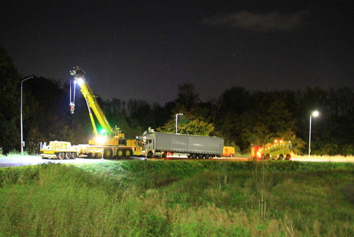 Een vrachtwagenchauffeur was van de weg geraakt en in een greppel tot stilstand gekomen. De bestuurder kon zelfstandig uit het voertuig komen en raakte niet gewond. Met behulp van een kraan en bergingswagens is de combinatie aan het begin van de avond geborgen.