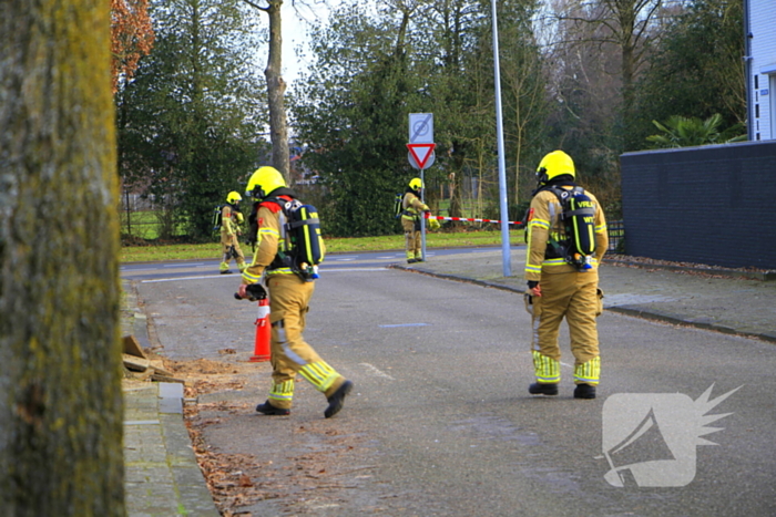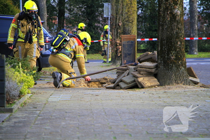De leiding is geraakt door werkzaamheden. De straat is afgezet met linten om de hulpdiensten de ruimte te geven. De brandweer doet onderzoek en verricht daarbij metingen.
