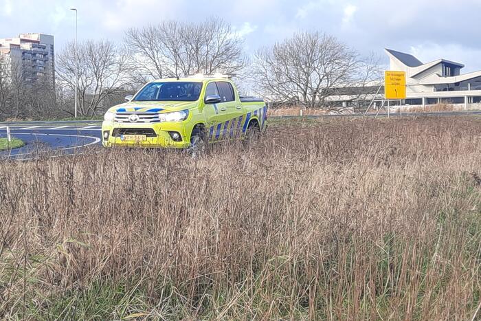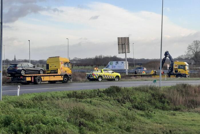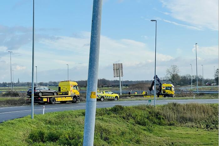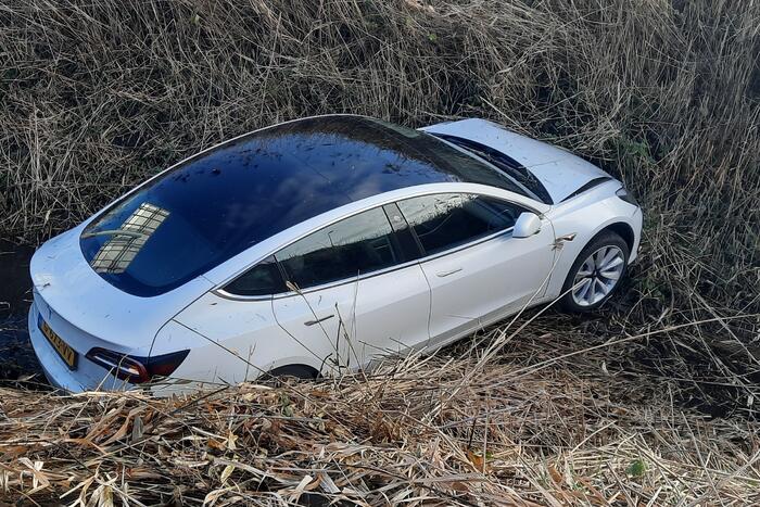 Een Tesla is in de naastgelegen sloot beland na een inhaalactie met een vrachtwagen. De bestuurder van de Tesla hield er alleen een nat pak aan over. Een berger is gekomen om de auto uit de sloot te halen en af te slepen.
