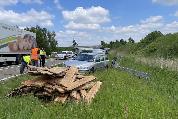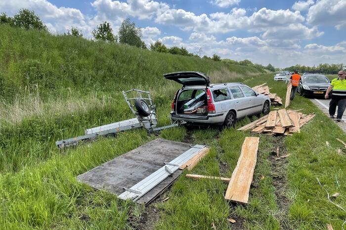 Een auto met aanhanger geladen met planken hout is gaan slingeren. De bestuurder verloor de macht over het stuur en is in de berm tot stilstand gekomen. De auto en aanhanger zullen door een berger moeten worden afgespeeld. Het verkeer ondervond enige hinder van het ongeval. Een rijstrook is tijdelijk dicht.