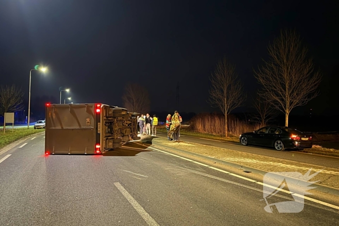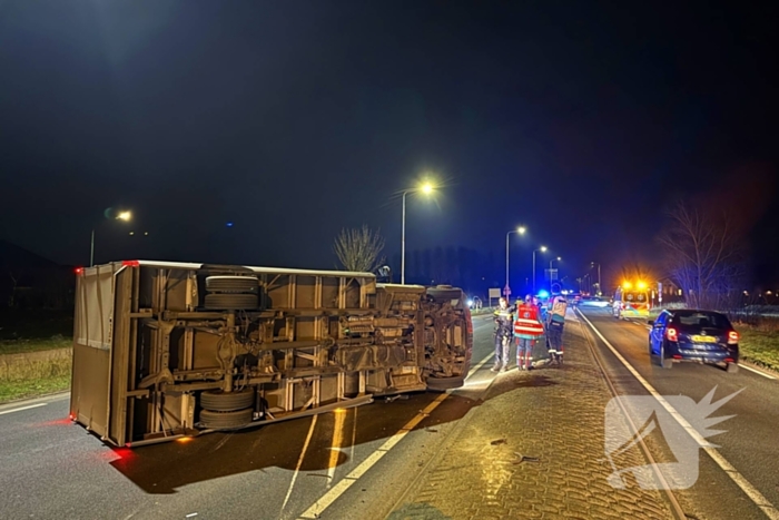 De bestuurder van het voertuig werd gecontroleerd door het ambulancepersoneel maar hoefde niet mee naar het ziekenhuis. Een berger zal de bakwagen weer op zijn wielen zetten en meenemen.