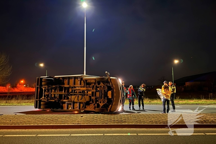 Door een nog onbekende oorzaak verloor een bestuurder van een bakwagen de controle over zijn voertuig na het verlaten van een rotonde. De bakwagen raakte in de slip en kantelde.