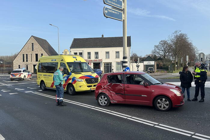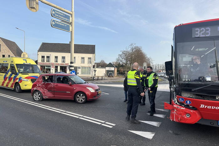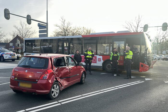 Op een kruising zijn een lijnbus met een personenauto in botsing gekomen. De bestuurster van de personenauto raakte bij het ongeval gewond en werd per ambulance overgebracht naar het ziekenhuis. De passagiers uit de bus zijn door een andere bus naar hun bestemming gebracht.