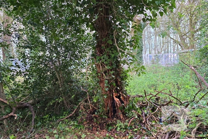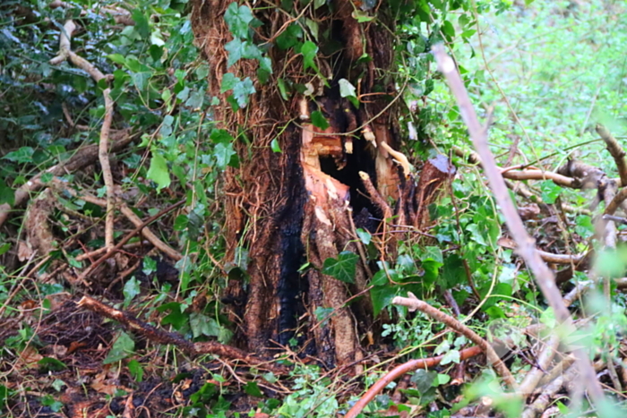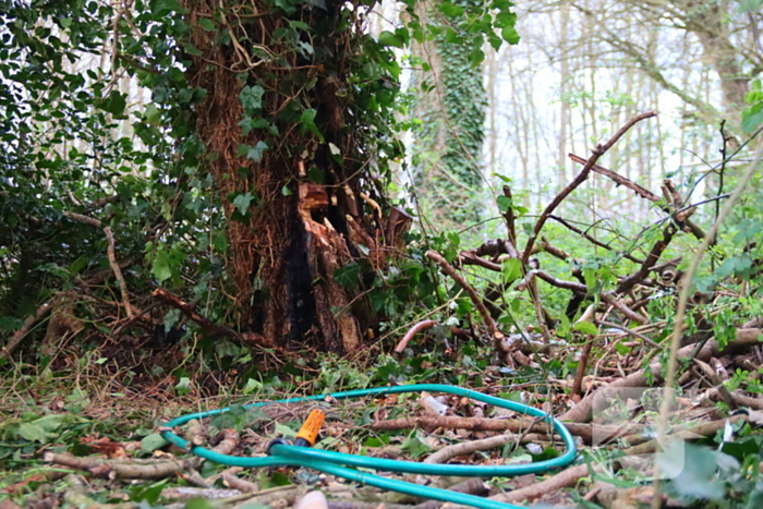 De brand ontstond in een boomstam door spelende kinderen. Brandweerlieden hebben de brand gedoofd met behulp van een tuinslang.