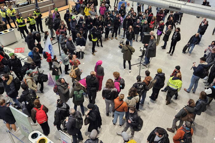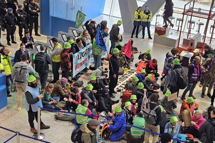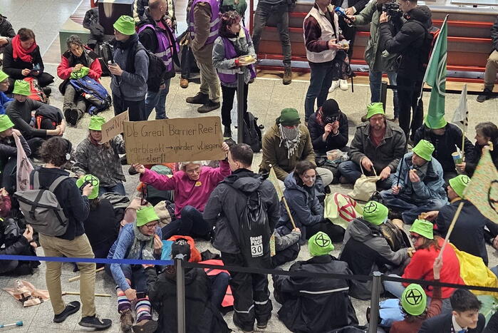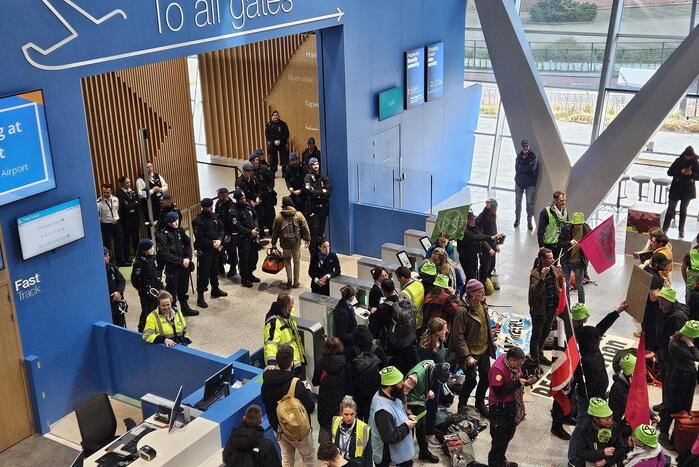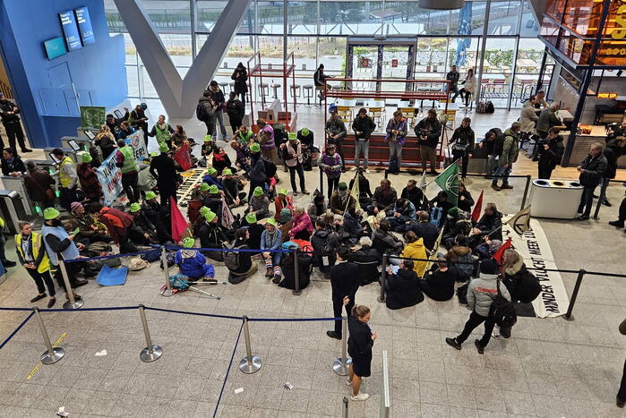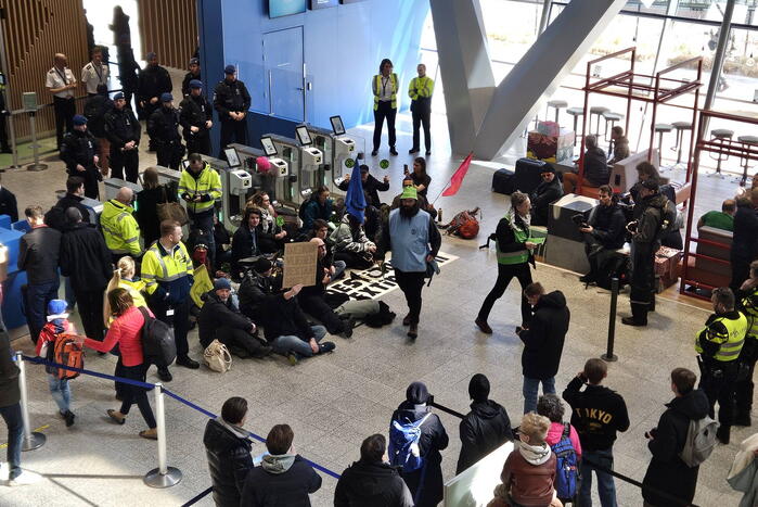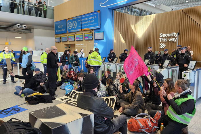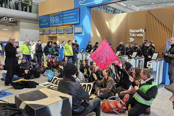 Extinction Rebellion blokkeerde de toegang tot de gates van Eindhoven Airport. De Koninklijke marechaussee houdt de demonstranten tegen. De demonstratie is tegen de vermindering van het aantal vluchten en voor het verbannen van privéjets. Ook buiten is een groep aan het demonstreren.