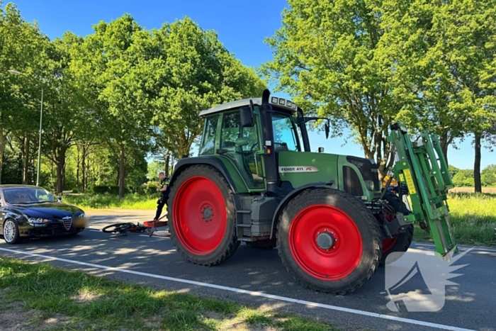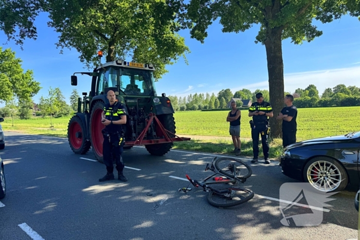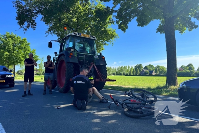 Een 15-jarig kind op een fiets is aangereden door een tractor. Door de aanrijding heeft het kind letsel aan het been opgelopen en is de fiets flink beschadigd. Nadat het slachtoffer was gestabiliseerd, is deze met onbekende verwondingen naar het ziekenhuis vervoerd.