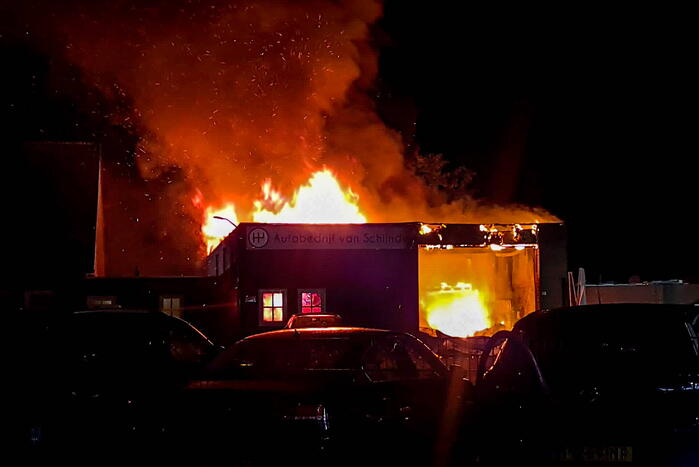 De brandweer probeert de woning naast het autobedrijf te redden. Over de oorzaak van de grote brand is niets bekend.