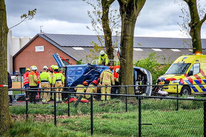 Een automobilist was tegen de zijkant van een bestelbus aangereden, hierop kantelde de bestelbus op de zijkant en kwam tegen een boom tot stilstand. De inzittende van de bestelbus raakte bekneld in het voertuig. De brandweer heeft, met behulp van speciaal gereedschap, het dak van de bestelbus afgeknipt waarna het slachtoffer uit het voertuig gehaald kon worden. Het slachtoffer is door een trauma-arts van het Mobiel Medisch Team en het ambulancepersoneel behandeld. Uiteindelijk is het slachtoffer per ambulance overgebracht naar het ziekenhuis.