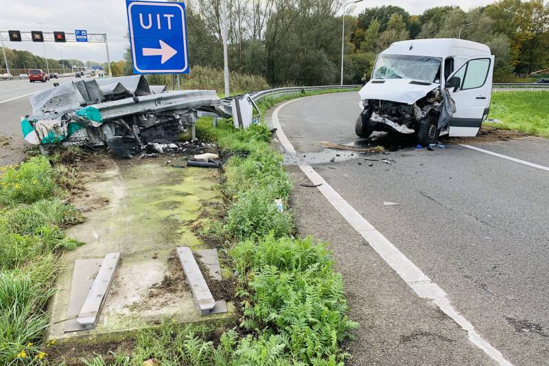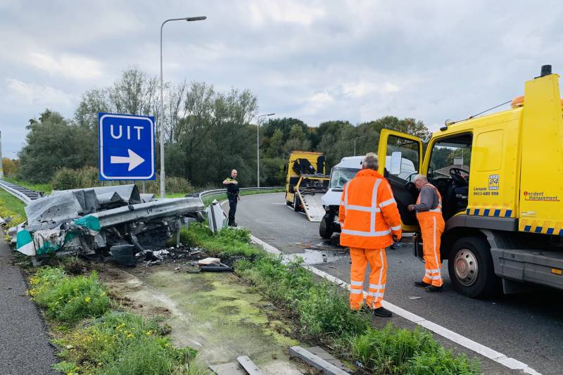 Een bestelbus is op de afrit frontaal op een RIMOB gebotst. De schade aan de bestelbus is groot. De bestuurder van de bestelbus is hierbij gewond geraakt en met onbekende verwondingen naar het ziekenhuis vervoerd. Door de aanrijding is zowel de afrit als een rijbaan afgesloten. Rijkswaterstaat laat de RIMOB direct repareren dit zal tot zeker 19.00 uur gaan duren. Een berger heeft de bestelbus weggesleept.