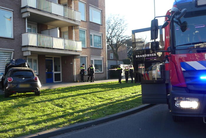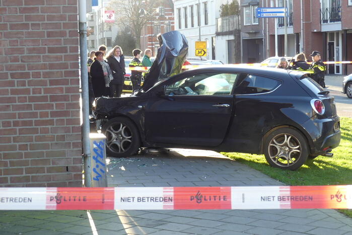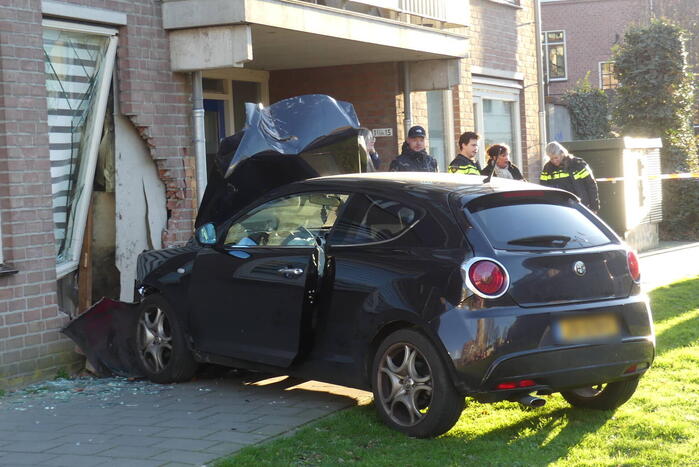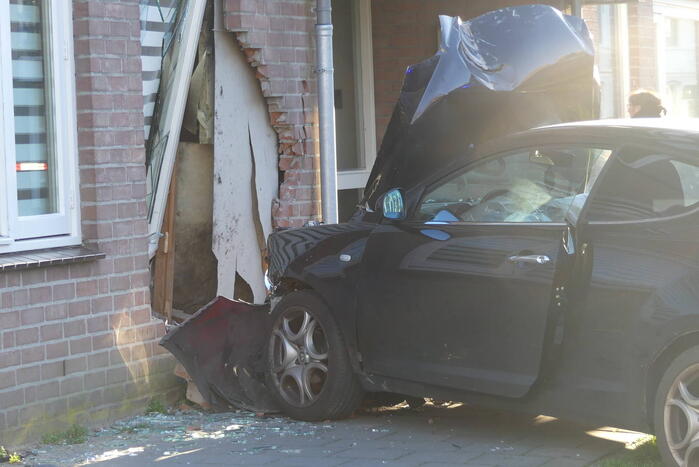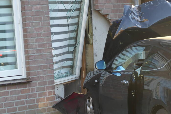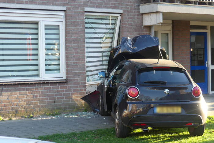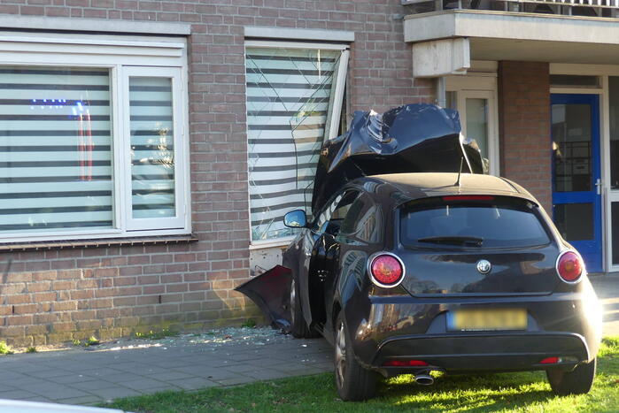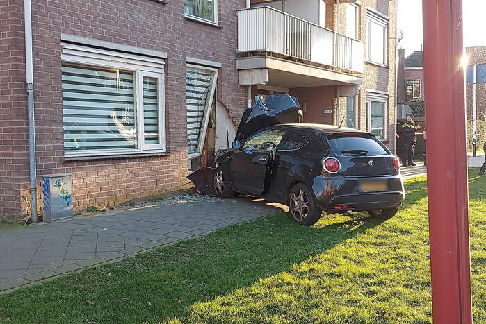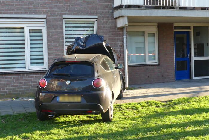 De brandweer heeft de auto veiliggesteld. Het gebouw zal gecontroleerd worden op instortingsgevaar.