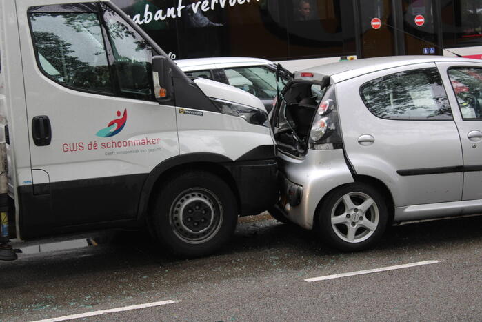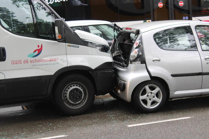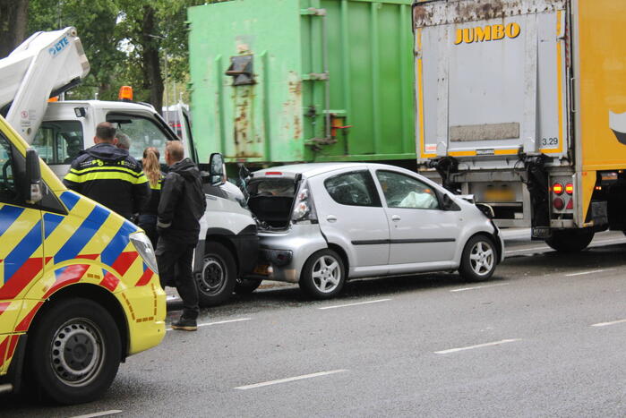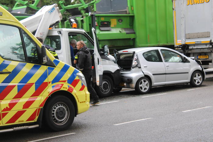 Door nog onbekende oorzaak zijn een vrachtwagen, auto en een bedrijfswagen in botsing gekomen. De inzittende van de auto is behandeld in een ambulance. Het middelste voertuig raakte bij de botsing flink beschadigd.