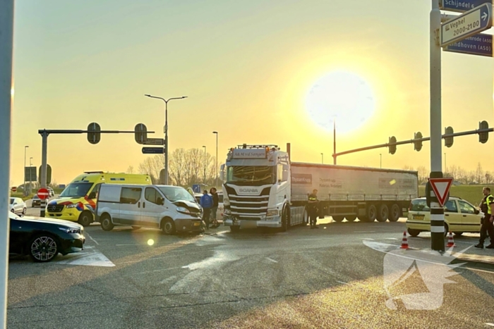 Bij het incident zijn een bestelbus en een vrachtwagen met elkaar in botsing gekomen. De inzittenden zijn gecontroleerd door een ambulanceverpleegkundige, waarbij een inzittende met onbekende verwondingen naar het ziekenhuis is vervoerd.