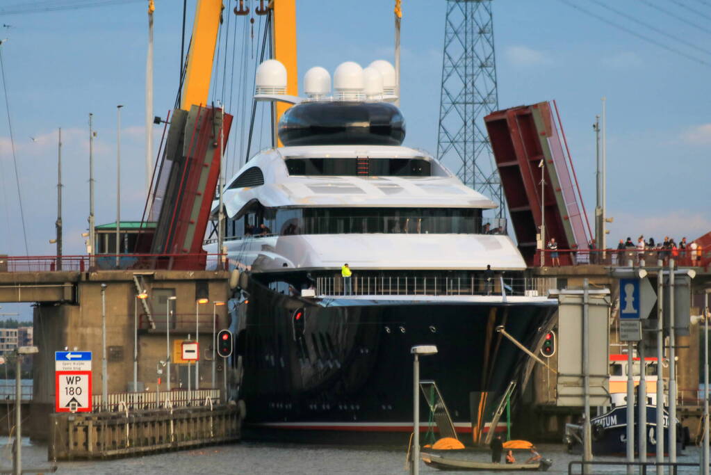 Feadship's grootste superjacht past net onder Schellingwouderbrug