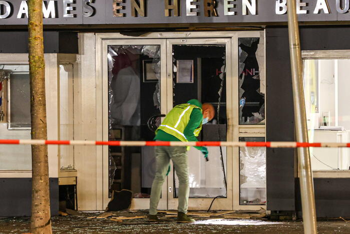 Een Turkse kapperszaak was het doelwit. De schade aan het pand zijn de ruiten, zo te zien. Hoe erg de schade aan de binnenkant is, valt nog niet te zeggen.